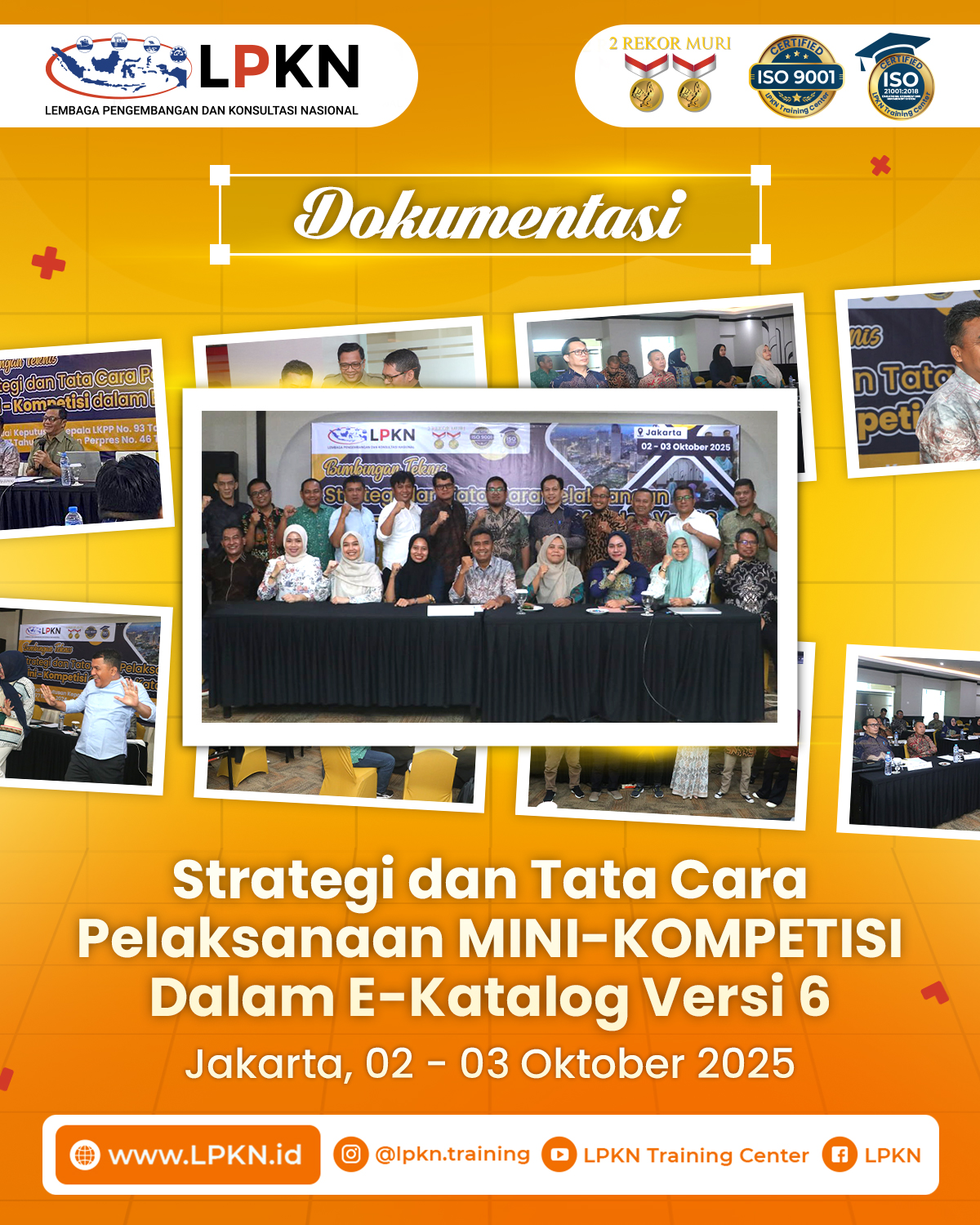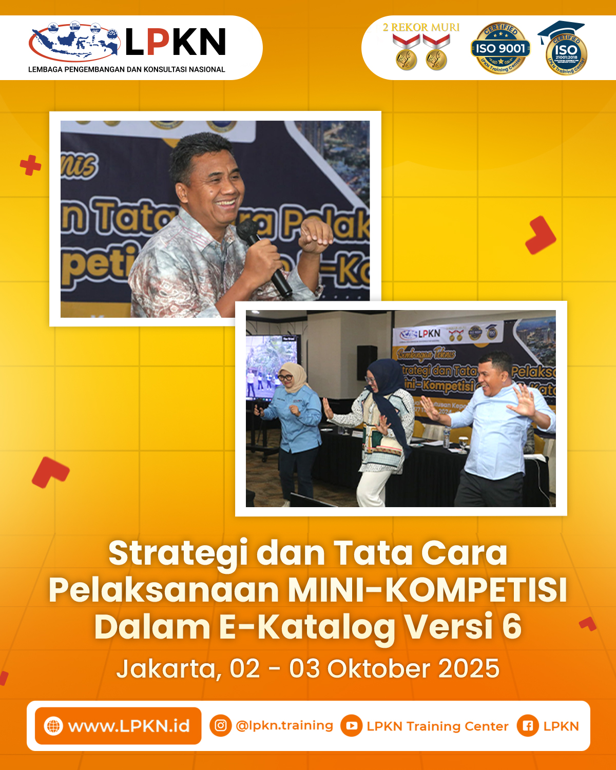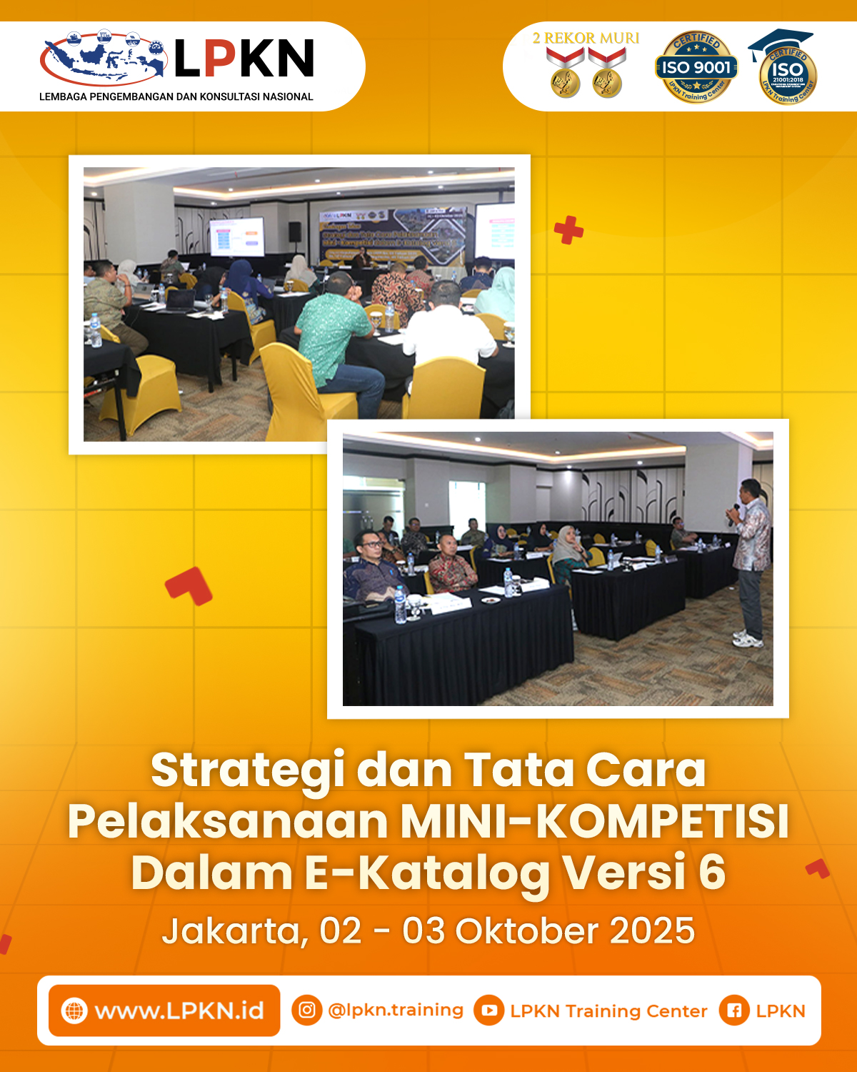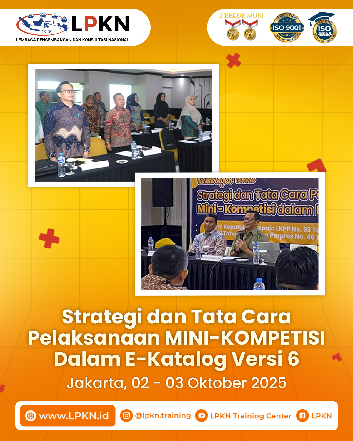Jakarta, 02–03 Oktober 2025 – Lembaga Pengembangan dan Konsultasi Nasional (LPKN) kembali menyelenggarakan kegiatan Bimbingan Teknis (Bimtek) Strategi dan Tata Cara Pelaksanaan Mini-Kompetisi dalam E-Katalog Versi 6, yang berlangsung di Hotel The Tavia Heritage Jakarta. Kegiatan ini mengangkat tema utama: “Peningkatan Kapasitas dan Kompetensi Aparatur dalam Pengelolaan Pengadaan Barang/Jasa melalui Mini-Kompetisi sesuai Kepka LKPP No. 93 Tahun 2025 dan No. 177 Tahun 2024.”